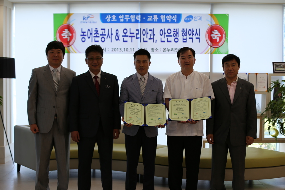10월 11일(금) 오후 1시 온누리안과 3층 라식센터에서는 한국농어촌공사 전북지역본부 김도현, 황용팀장님과 온누리안과 정영택대표원장님, 온누리안은행 오규정대표님, 전석진 본부장님 참석하에 상호 업무협력 및 교류를 위한 협약식이 거행되었습니다. 식을 마친 후 티타임을 갖는 자리에서는 각막이식수술비지원책 등 시각장애우를 위한 현실적 도움 방법 등을 강구하는 뜻 깊은 대화를 나누었습니다.