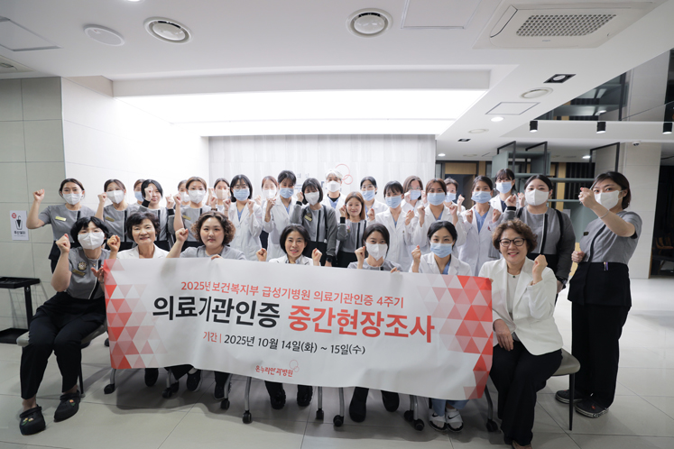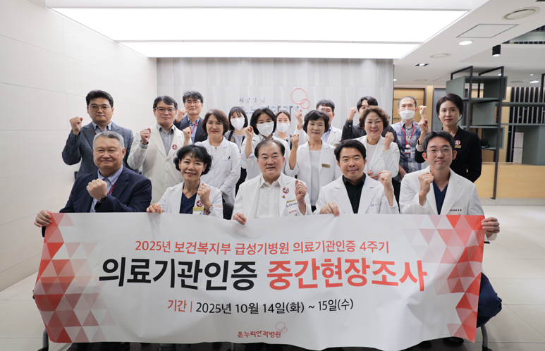 온누리안과병원 4주기 의료기관인증 중간평가 성료 -환자안전과 의료 서비스 질 향상을 위한 도약- 온누리안과병원은 2025년 10월 14일(화) 부터 이틀 동안 진행된 보건복지부 의료기관 인증 중간평가를 성공적으로 마무리했습니다. ![]() 이번 평가는 인증을 획득한 의료기관이 환자 안전과 의료의 질 유지를 위해 지속적으로 노력하고 있는지 여부를 조사 위원이 현장을 직접 방문하여 점검하는 과정입니다. 조사 위원들은 온누리안과병원 검사 및 진료, 수술과 입원 등 모든 환자 동선의 현장 라운딩을 통해 의료 공간, 시설, 인적 자원 관리 등을 면밀히 확인했습니다. 또 담당 부서별 심층 인터뷰와 질의응답을 진행하여 필수 기준을 포함한 주요 관리 항목들의 이행 여부를 점검했습니다. ![]() 온누리안과병원은 2023년 지역 안과병원 최초로 의료기관 인증을 획득한 후 그동안 자격과 요건을 철저히 이행해 왔습니다. 특히 이번 중간평가에 임하며 의료 장비와 시설 투자, 우수 의료인력 충원과 동시에 전체 의료진과 임직원이 한마음으로 응급 훈련 등을 준비했습니다. ![]() 그 결과, 만족스러운 평가와 인증 기준을 충족하며 전문적이고 질 높은 의료 서비스 제공 능력을 다시 한번 입증했습니다. 온누리안과병원은 보건복지부 인증 의료기관으로서 자부심과 사명감으로 환자 안전과 의료의 질 향상을 위해 지속적으로 노력하겠습니다. ![]() 전북 지역 거점 안과병원으로서 주어진 역할에 최선을 다하며 미래 100년을 향해 나아가겠습니다. |