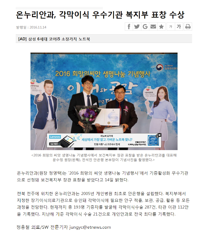 온누리안과, 각막이식 우수기관 복지부 표창 수상