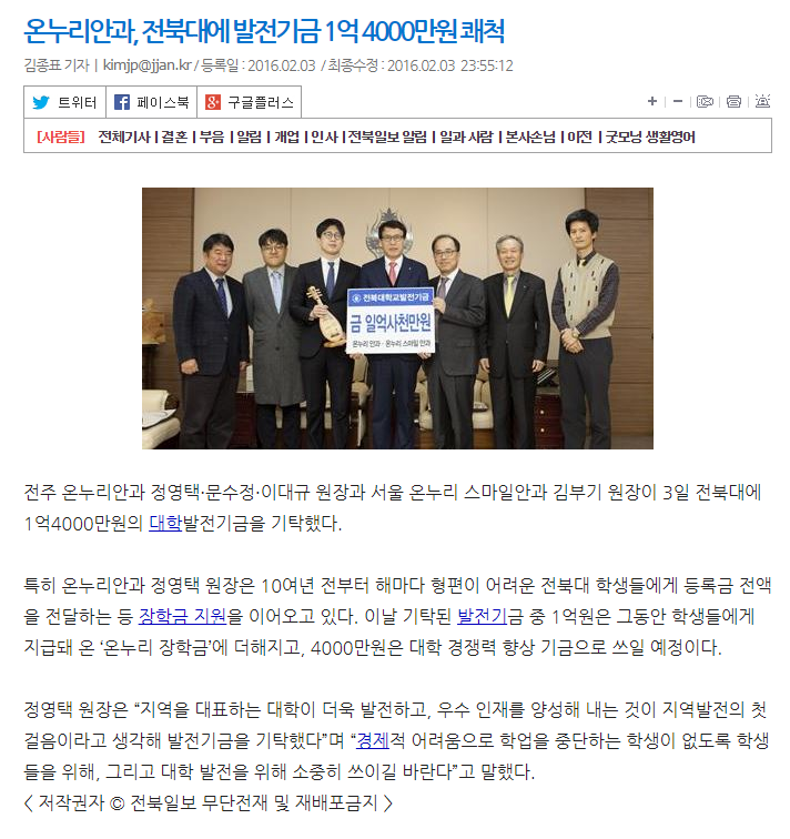 온누리안과, 전북대에 발전기금 1억 4000만원 쾌척