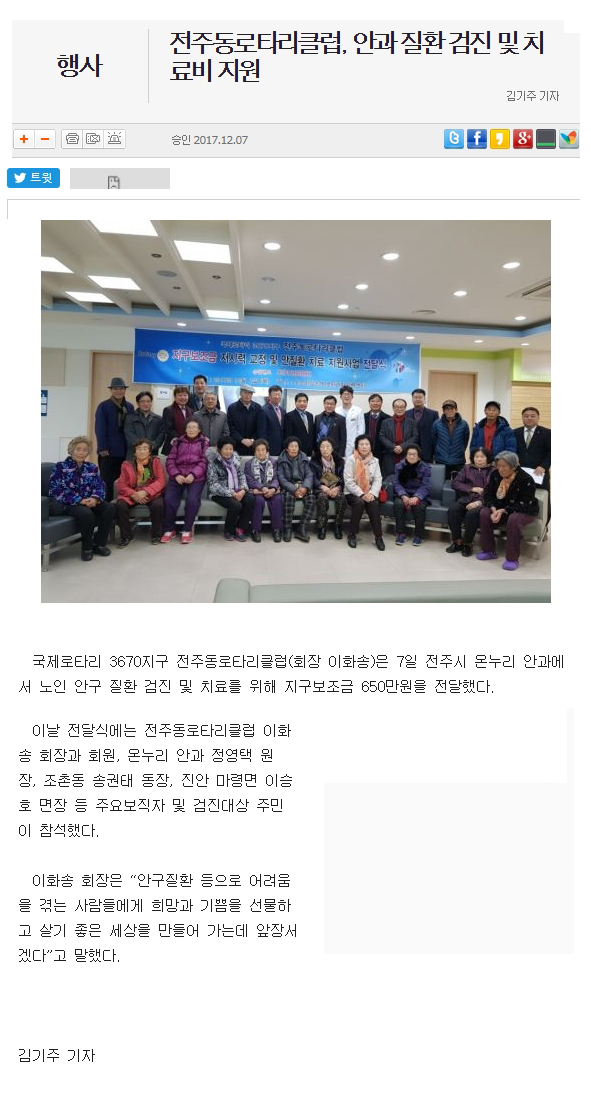 전주동로타리클럽, 안과 질환 검진 및 치료비 지원