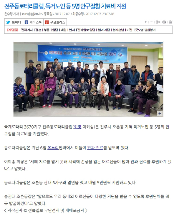 전주동로타리클럽, 독거노인 등 5명 안구질환 치료비 지원