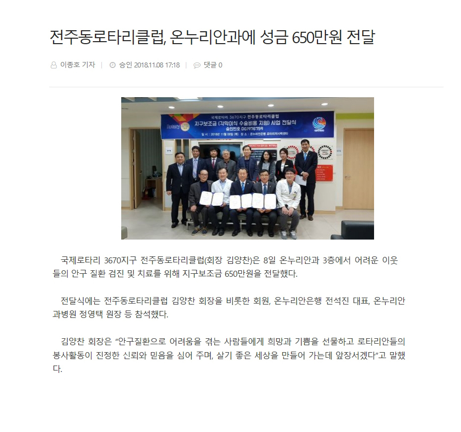 전주동로타리클럽 각막이식 수술지원금 전달