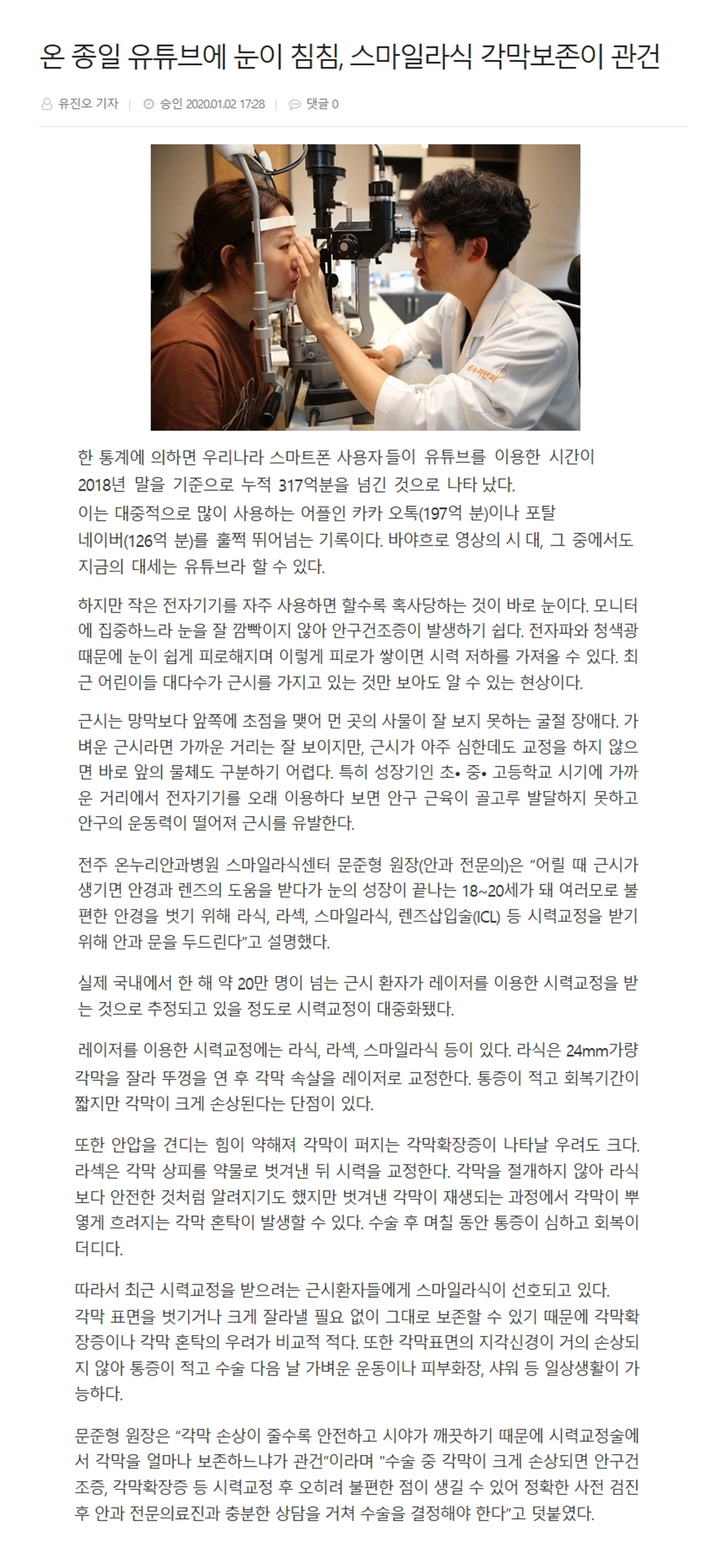온 종일 유튜브에 눈이 침침, 스마일라식 각막보존이 관건