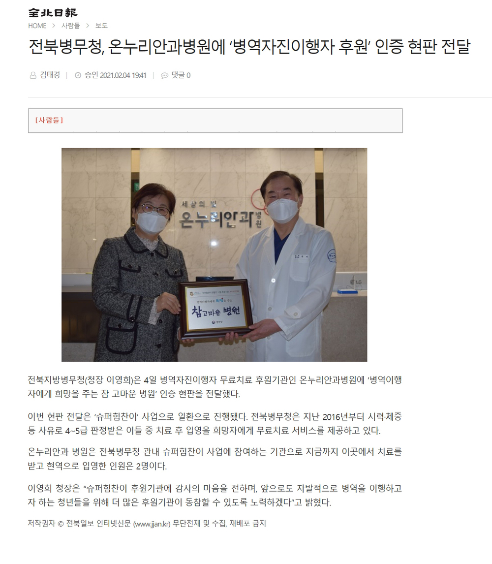 전북병무청, 온누리안과병원에 ‘병역자진이행자 후원’ 인증 현판 전달