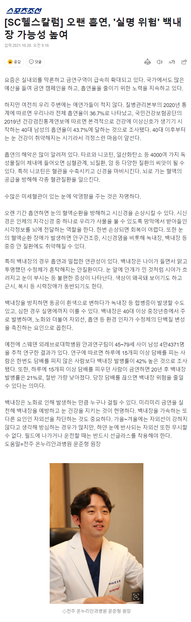 오랜 흡연, '실명 위험' 백내장 가능성 높여