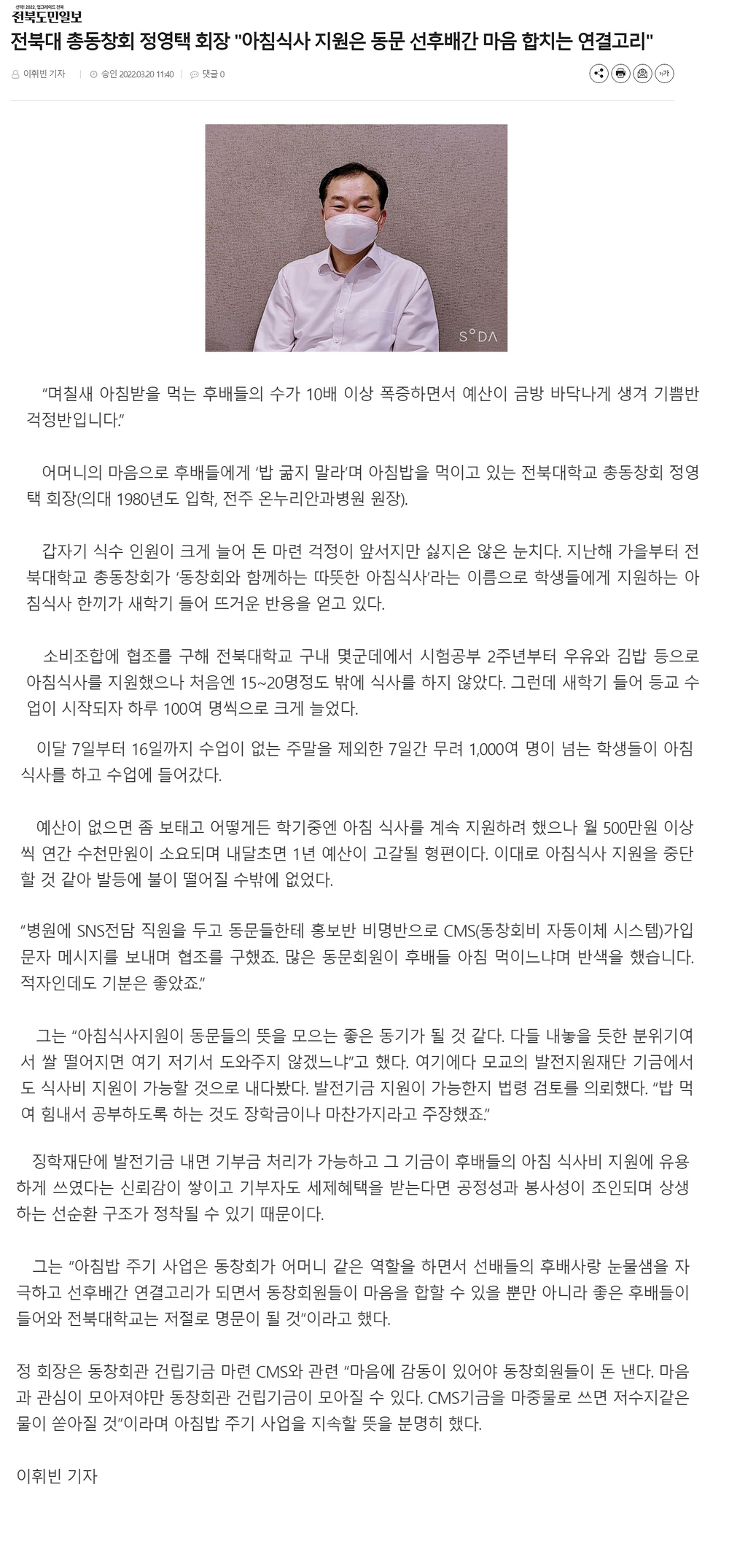 전북대 총동창회 정영택 회장 "아침식사 지원은 동문 선후배간 마음 합치는 연결고리"