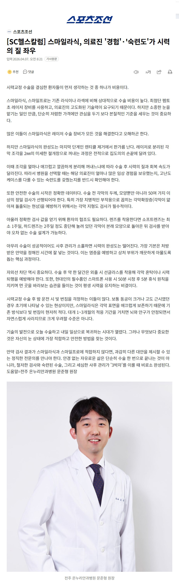 스마일라식, 의료진 '경험'·'숙련도'가 시력의 질 좌우_문준형 원장